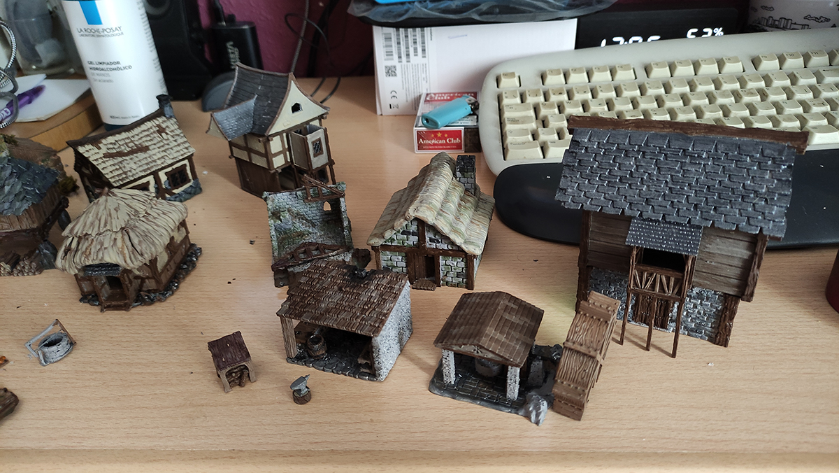 La construcción de la aldea no era solo cuestión de ensamblar piezas; requería un toque de realismo que solo se logra a través de la pintura. Aquí comenzó mi inmersión en el mundo de las técnicas de pintura en miniatura. Pasé horas viendo tutoriales, experimentando con colores y estilos, y poco a poco, mi aldea cobró vida.