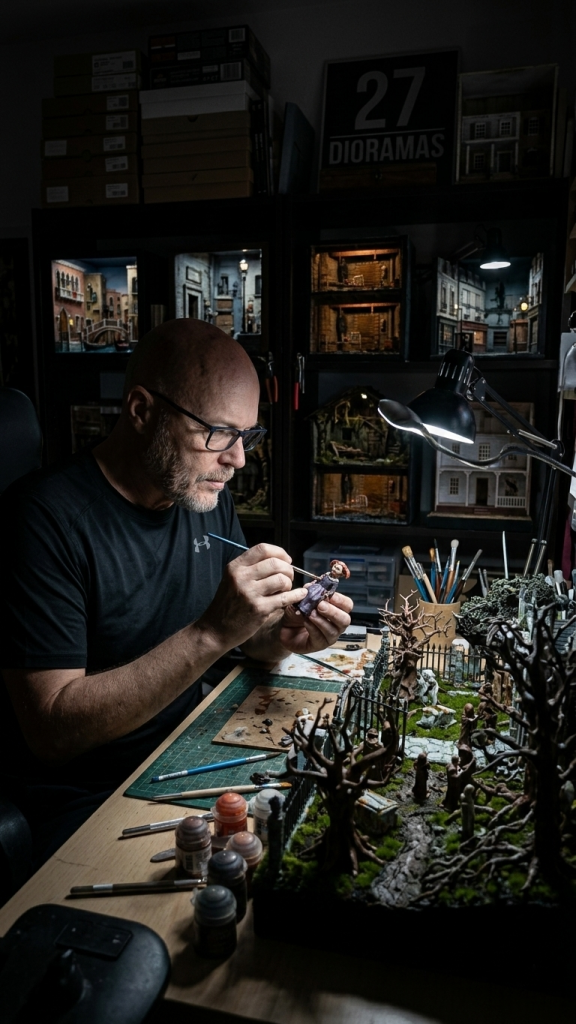 Como montador de vídeo y realizador, paso mis días construyendo relatos a través de una pantalla. Sin embargo, en 27dioramas encontré la forma de llevar esa narrativa al mundo físico. Mis dioramas son, en esencia, «escenas congeladas» donde aplico la misma mirada que en el montaje audiovisual: busco el ángulo perfecto, la iluminación que genera tensión y el detalle que cuenta una historia sin necesidad de palabras.